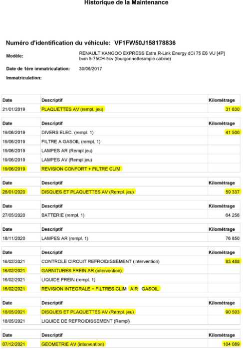 | Etat freins AV | Aucuns défauts |
