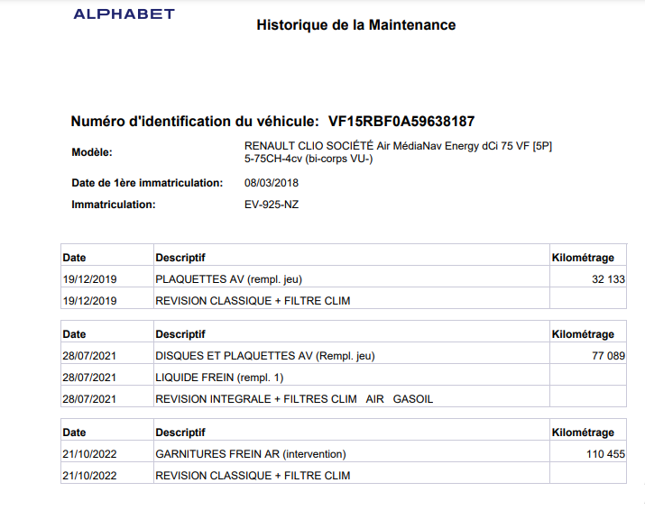 | Etat freins AV | Aucuns défauts |